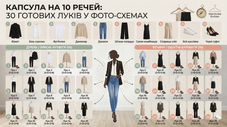 Капсула на 10 речей: 30 готових луків у фото-схемах